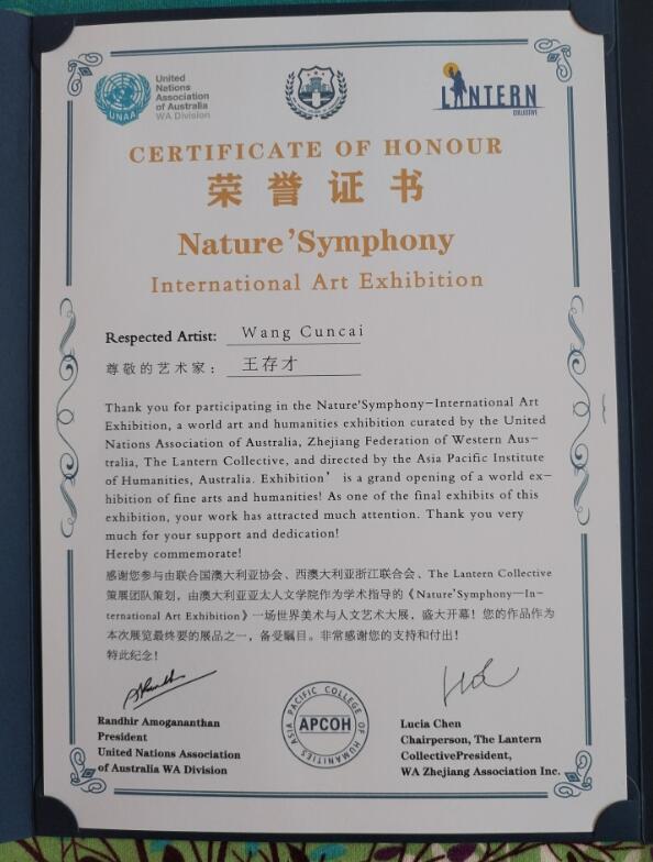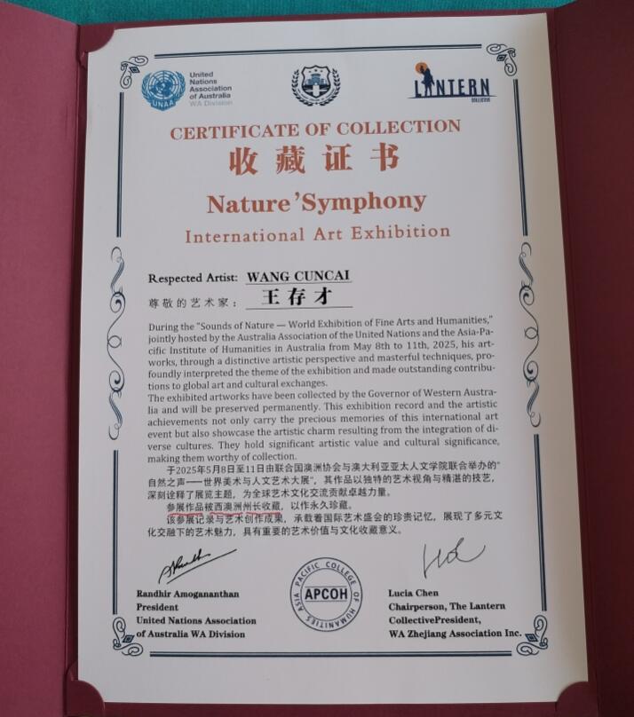 喜讯:由澳大利亚亚太人文学院和联合国澳洲协会共同发起的“自然之声-世界美术与人文艺术大展”,以保护自然可持续发展为核心,以绘画艺术反应当下世界而临的环境为题,以自然和人文艺术相结合,挖掘人与自然的深层联系展开探讨和交流。通过艺术这一具有震撼力和感染力的表达形式,启发观众从理性与感性两个层面重新审视自然的意义,思考现代社会中可持续发展的重要性。