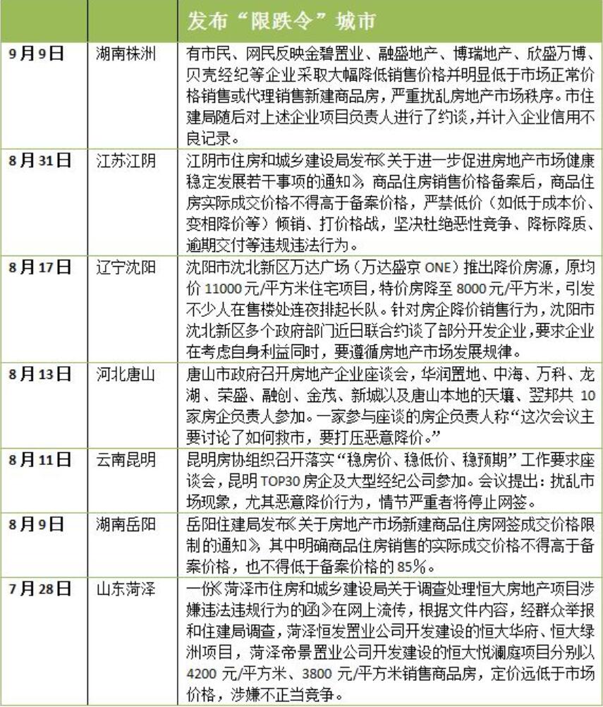 据澎湃新闻不完全统计,截至目前,包括株洲、江阴、菏泽、岳阳、昆明、沈阳、唐山等7城公布房价“限跌令”。