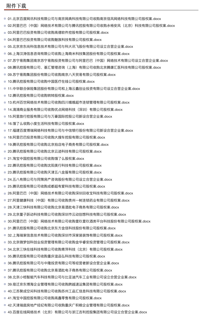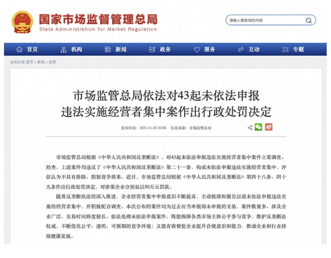 市场监管总局网站11月20日消息,市场监管总局根据《中华人民共和国反垄断法》,对43起未依法申报违法实施经营者集中案件立案调查。经查,上述案件均违反了《中华人民共和国反垄断法》第二十一条,构成未依法申报违法实施经营者集中,评估认为不具有排除、限制竞争效果。近日,市场监管总局根据《中华人民共和国反垄断法》第四十八条、四十九条作出行政处罚决定,对涉案企业分别处以50万元罚款。