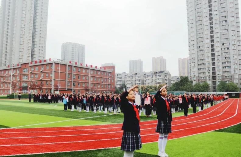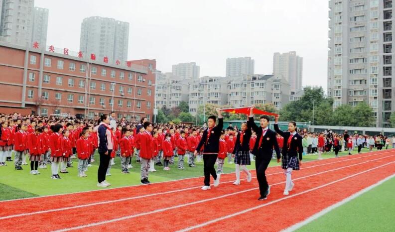 护旗手迈着整齐的步伐,护送着鲜艳的五星红旗走向升旗台。在激昂的国歌声中,五星红旗冉冉升起,全体师生庄严敬礼。