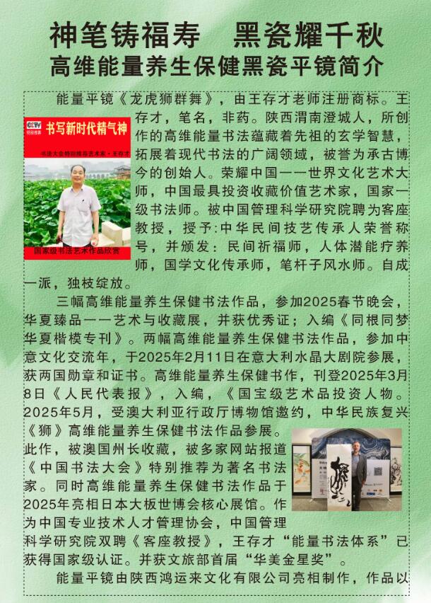 作为中国专业技术人才管理协会、中国管理科学研究院双聘客座教授,王存才的“能量书法体系”已获国家级认证。其“国家一级书法师”身份背后,更拥有“民间祈福师”“人体潜能疗养师”等五项绝学认证。而新问世的高维能量黑瓷平镜与《存才·龙虎狮群舞》商标,正将这项非遗创新推向产业化蓝海。王存才老师透露,“让龙虎狮的能量矩阵,守护每一个热爱中华文化的灵魂。”