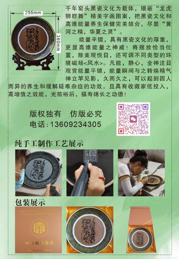 高维能量养生保健一一黑瓷平镜问世,就受到了各界人士的好评,今在教师节的日子,《能量书法发平镜》又被西安盛唐书画艺术研究院收藏,实乃一大喜讯。