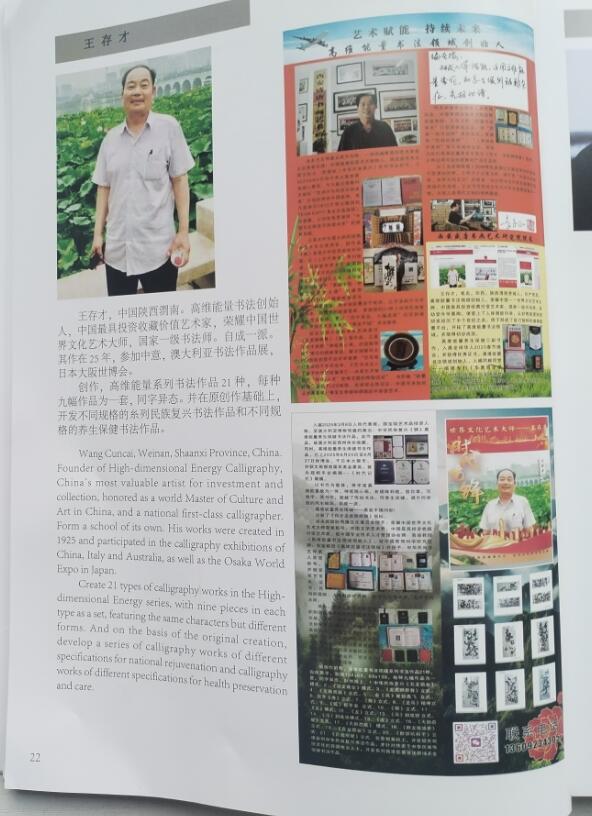 该书刊精选了王存才书法老师创作的高维能量系列书法作品21种,每种九幅作品为一套,同字异态。并在原创作基础上,开发不同规格的系列民族复兴书法作品和不同规格的养生保健书法作品,面向全球发行。高维能量书法领域创始人王存才老师的糸列书法作品,将会以神秘的宇宙高维空间能量跨出国门飘洋过海,必将进入欧美书画市场影响外籍人士对中国悠久历史文化的认知,全面弘扬中华民族复兴优秀文化传承发展。