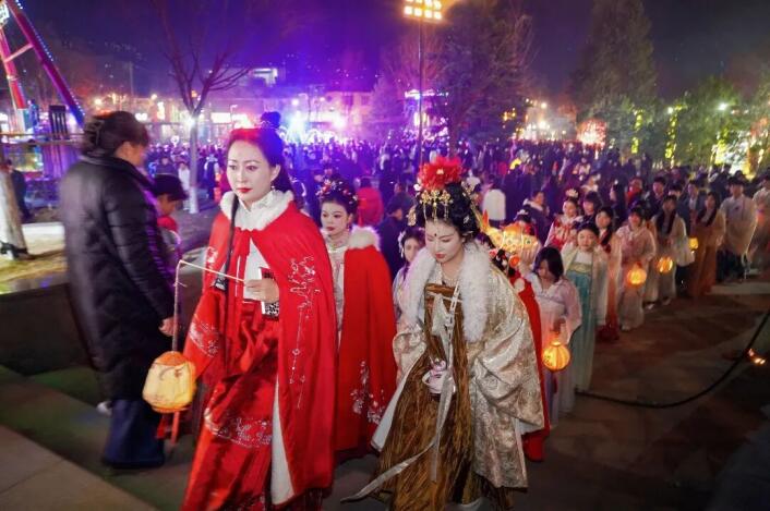 与此同时,承载着千年历史与美好寓意的三千条灯谜,在泰塔广场迎风招展,吸引着男女老少开动脑筋、争相竞猜。身着华美汉服的年轻人漫步于璀璨灯海之中,衣袂翩跹,仿佛穿越时空,为传统佳节增添了一抹流动的靓丽风景。